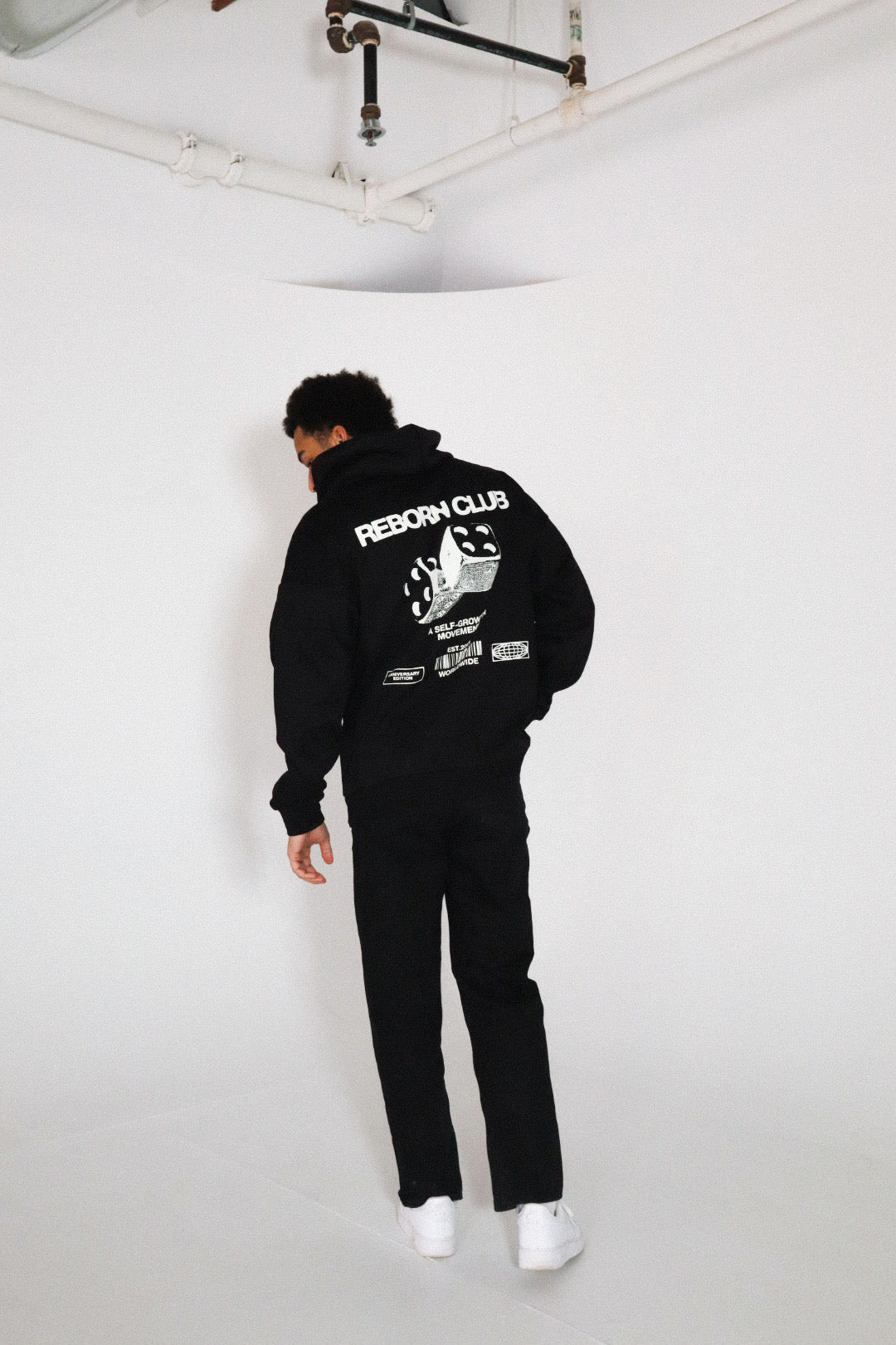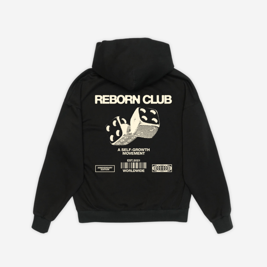 Reborn Club logo on front of hoodie